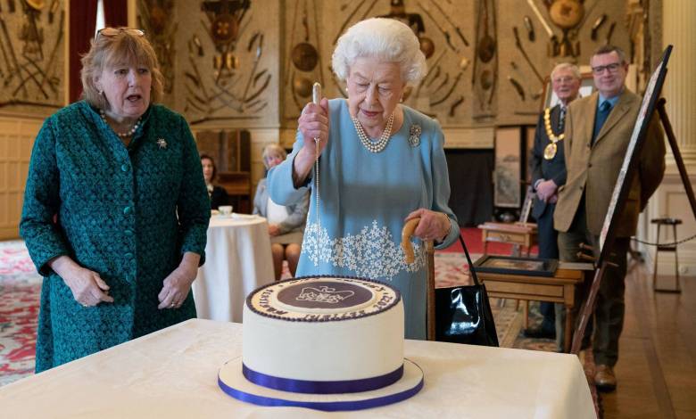#PraTodosVerem: foto colorida mostra a rainha Elizabeth 2ª, uma mulher idosa e de cabelos brancos, com uma na mão direita prestes a cortar um bolo branco com detalhes em azul. Ela está acompanhada de uma mulher, também idosa, de vestido verde escuro. Elizabeth usa um vestido azul com detalhe branco na cintura e tem pendurada no braço esquerdo uma pequena bolsa preta. Na parte inferior da imagem, lê-se “Elizabeth 2ª comemora 70 anos no trono em meio a, mais uma vez, crises familiares”