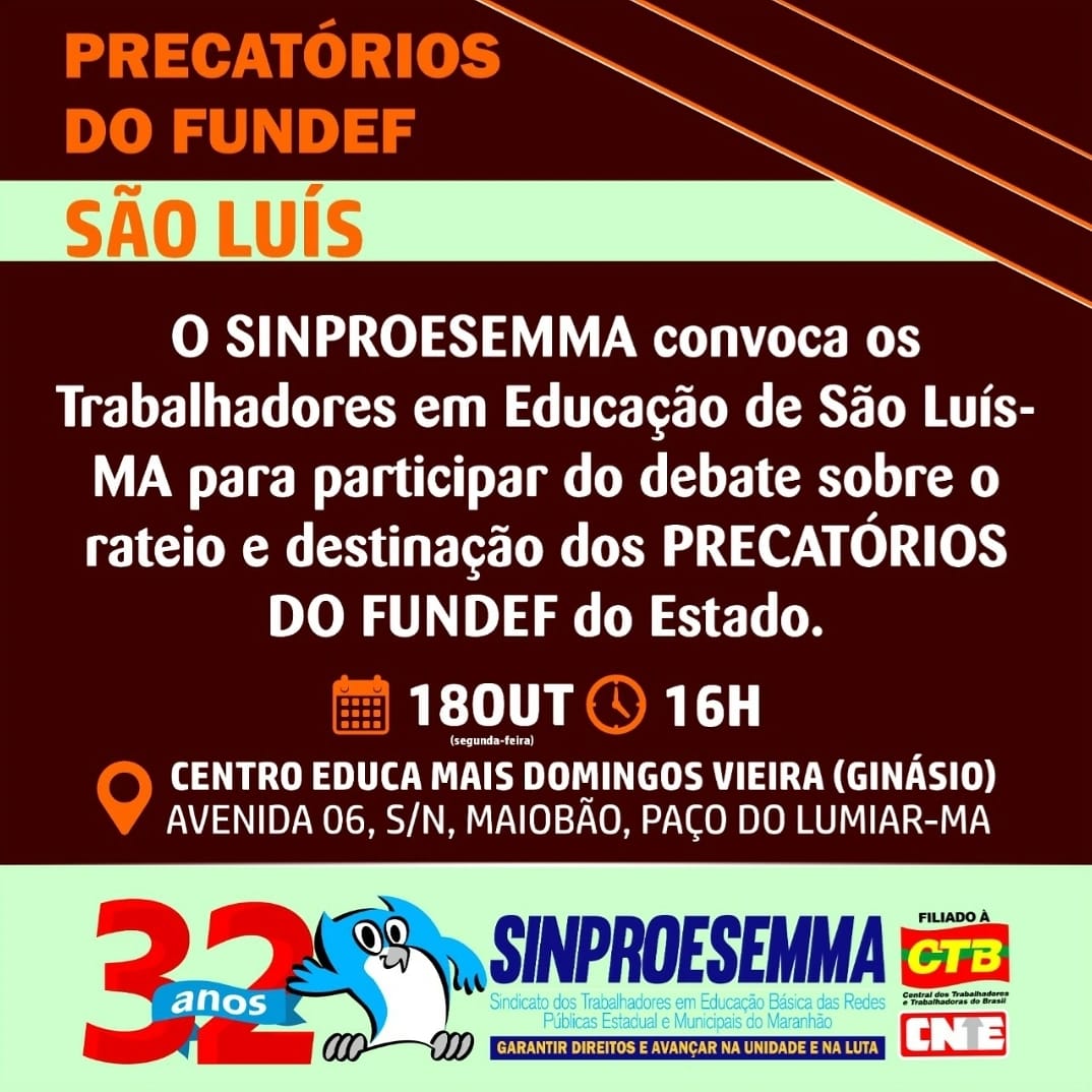 ✅ O Sinproesemma convoca todos/as para participar do debate sobre o rateio e destinação dos precatórios do FUNDEF da capital maranhense. 🗓 Dia: 18 de