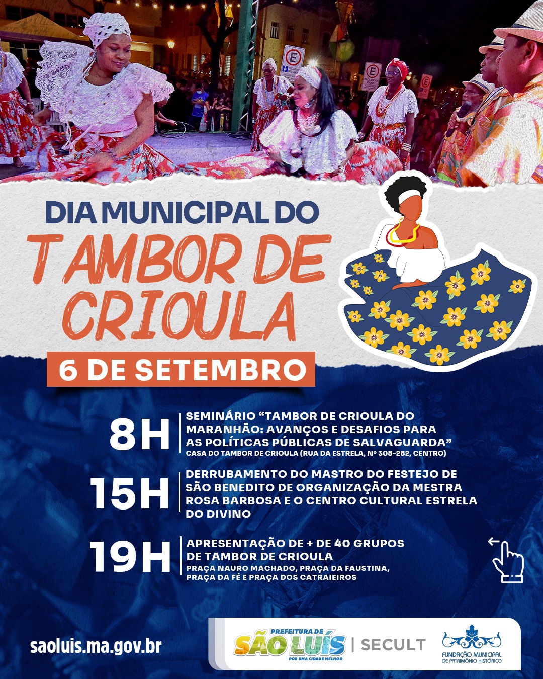 Para celebrar o Dia Municipal do Tambor de Crioula e seus Brincantes, a Prefeitura de São Luís, por meio da Fundação Municipal de Patrimônio Histórico (Fumph) e Secretaria Municipal de Cultura (Secult), realizará uma programação nesta quarta-feira (6), a partir das 8h. A programação, composta por apresentações culturais e debate, acontecerá na Casa do Tambor de Crioula e nas praças Nauro Machado, Faustina, da Fé e Catraieiros, na Praia Grande, Centro Histórico.