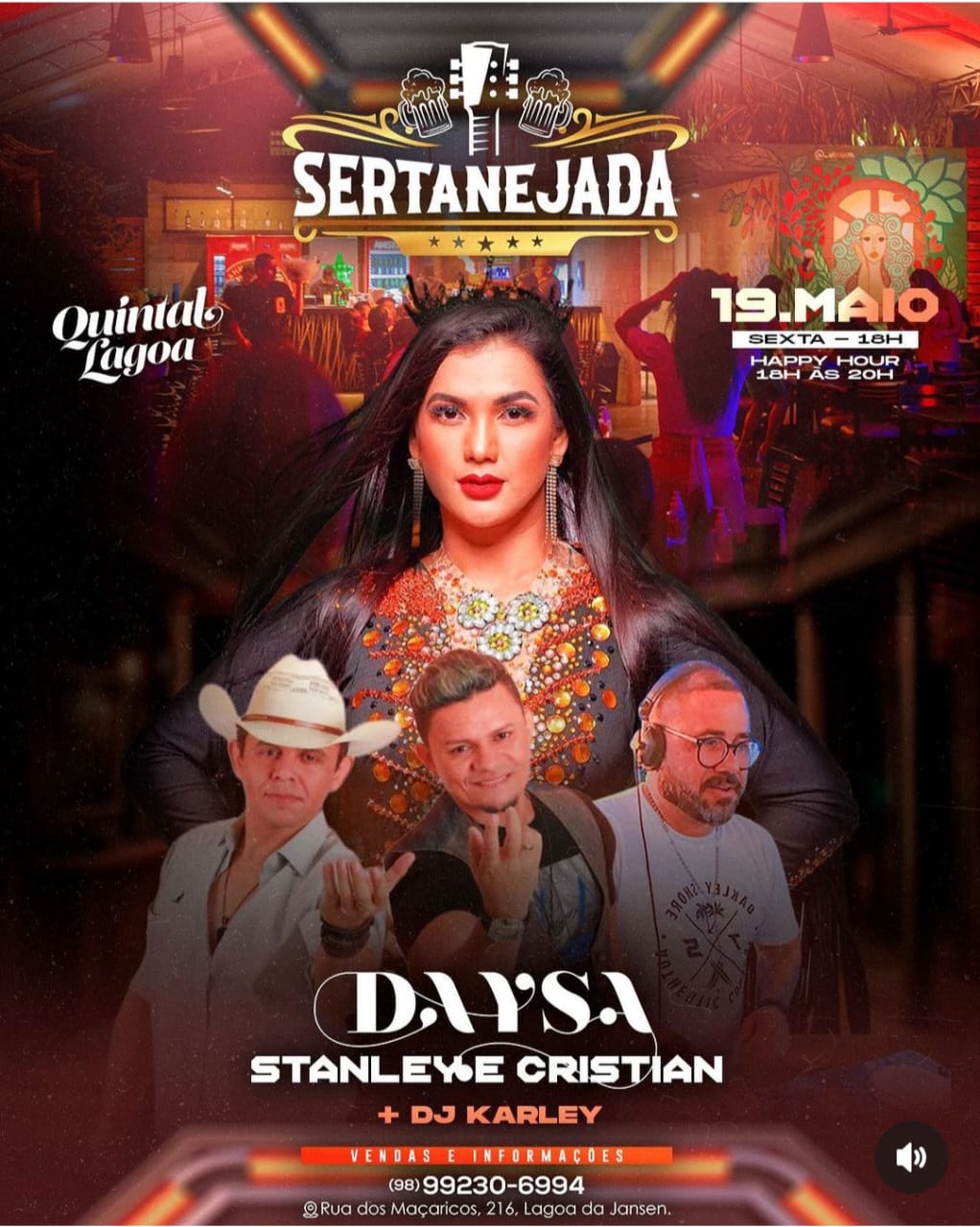 Dia 19 de maio (sexta-feira) tem a “Sertanejada” no Quintal Lagoa! O único gastrobar com essência de boteco da Lagoa da Jansen recebe a cantora Daysa cantando grandes hits e a dupla sertaneja mais famosa de São Luís: Stanley & Cristian. Outra atração da noite é o DJ Karley. Lembrando que a casa abre a partir das 18h, oferecendo happy hour e as reservas já podem ser feitas no 98 99230-6994.
